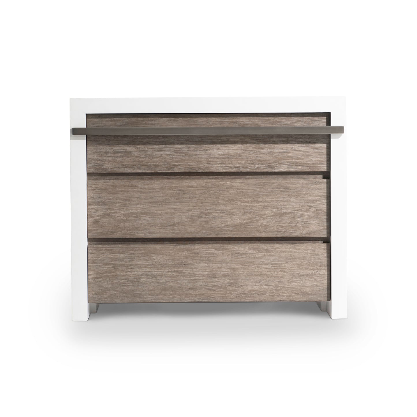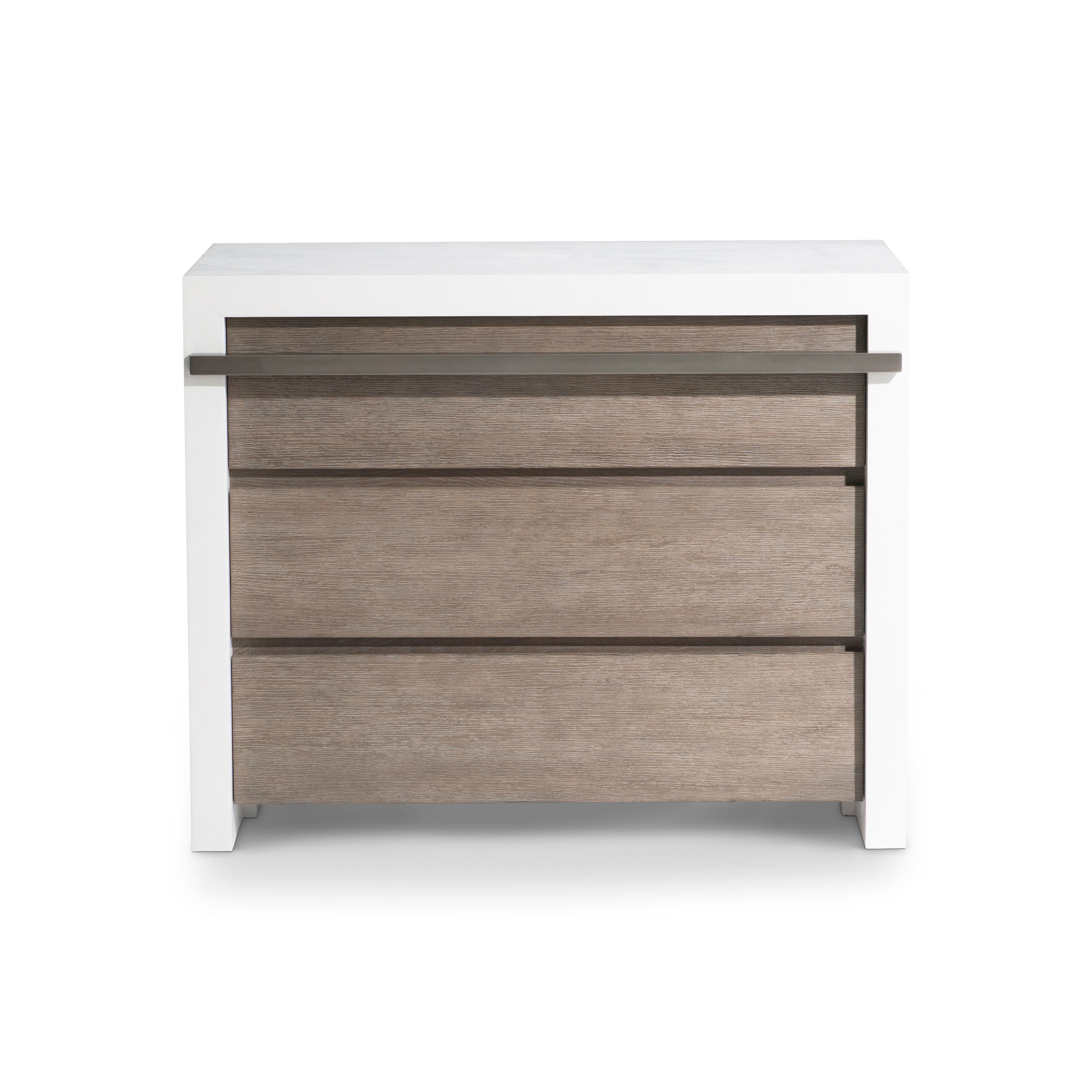 The Westfall nightstand takes a bold stance with a daring design and mixed finishes. A trick to the eyes, it looks as if a simple wood case in Bluff finish is enveloped by a white cover, showcasing notched sides. A two-port USB charging system adds a high-tech touch on the back of the case.
