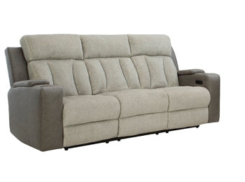 Refined relaxation, reimagined for the modern home. This power reclining sofa combines premium comfort with smart features like built-in storage arms, wireless charging and a drop-down table. One-touch reclining and adjustable headrests let you find your perfect position, while luxurious heat and massage functions melt away the day's stress. And for an added dose of style, it's wrapped in a two-tone upholstery that pairs soft textured fabric with coordinating faux leather.