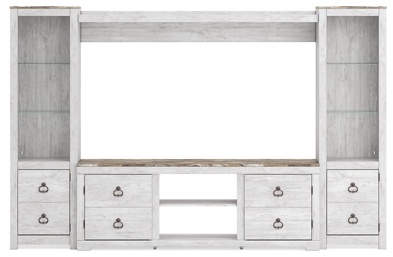 This entertainment center is the ultimate statement piece for a coastal cottage or country chic inspired retreat. Its whitewashed finish is wonderfully easy on the eyes, and the plank styling and driftwood look have us dreaming of seaside sunsets. Packed with potential, two cabinet doors with ring pulls reveal concealed storage/display space. Two tall piers with glass shelving and soft overhead LED lighting allow you to put home accents on display, safely out of the way.