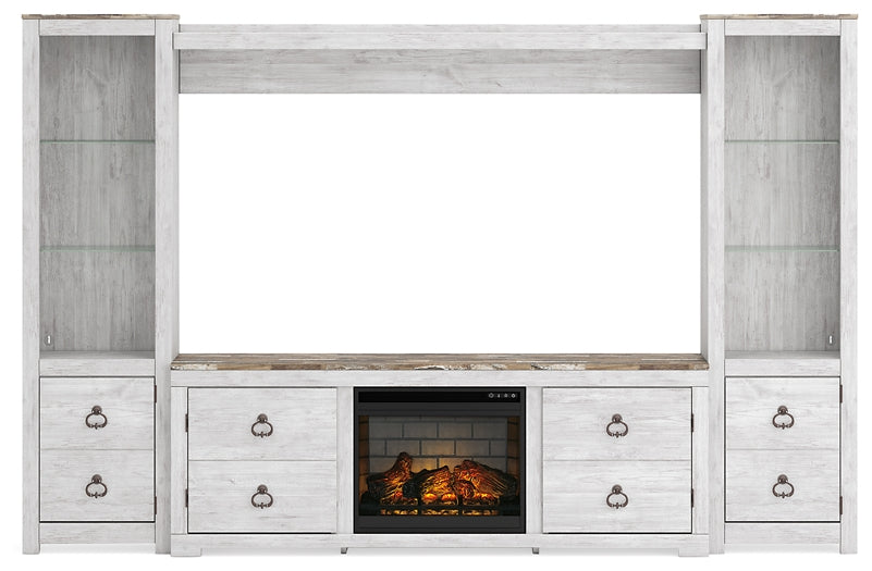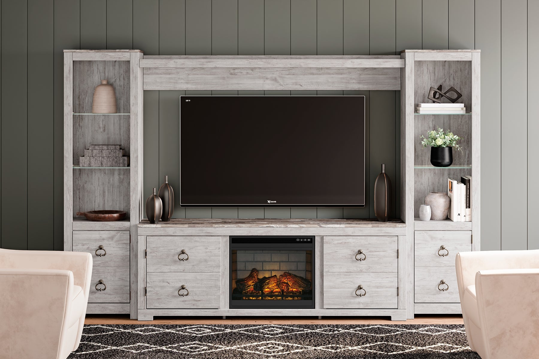 This entertainment center with fireplace insert is the ultimate statement piece for your coastal cottage or shabby chic inspired retreat. Its whitewashed finish is wonderfully easy on the eyes. Combined with the plank styling, it's a driftwoody look that has us dreaming of beachy-keen escapes. Packed with potential, there's ample room to store and display. What really turns up the heat: an electric infrared fireplace insert with faux firebrick surround that operates with or without infrared heat. With the touch of a button, adjust the temperature and the flame brightness, and set the timer for long-lasting enjoyment.