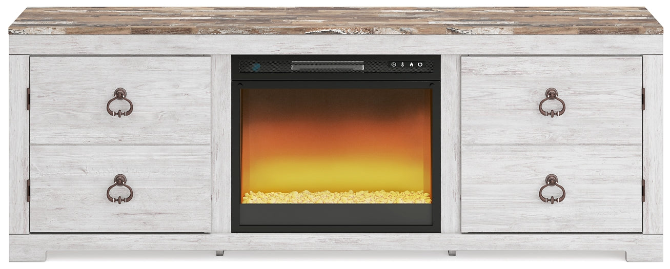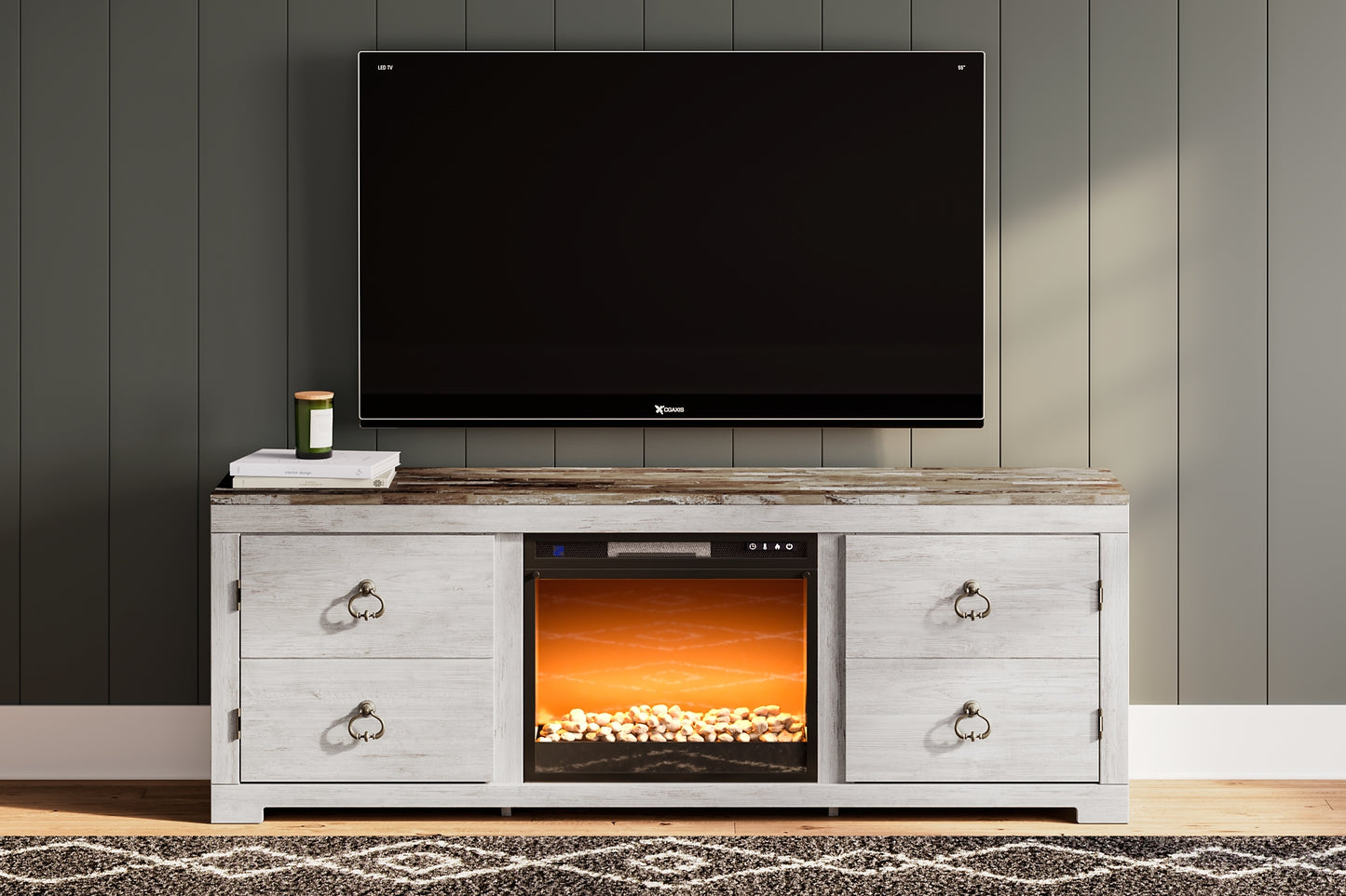 This TV stand with electric fireplace is the ultimate statement piece for a coastal cottage or country chic inspired retreat. Its whitewashed finish is wonderfully easy on the eyes, and the plank styling and driftwood look have us dreaming of seaside sunsets. Packed with potential, two cabinet doors with ring pulls reveal concealed storage/display space. Adding that much more show-stopping style, the electric fireplace insert operates with or without heat and includes a six-level temperature setting, a remote control and an overheating control for added safety. It comes with faux glass crystals and natural stones, so you can customize the look of the flame bed.