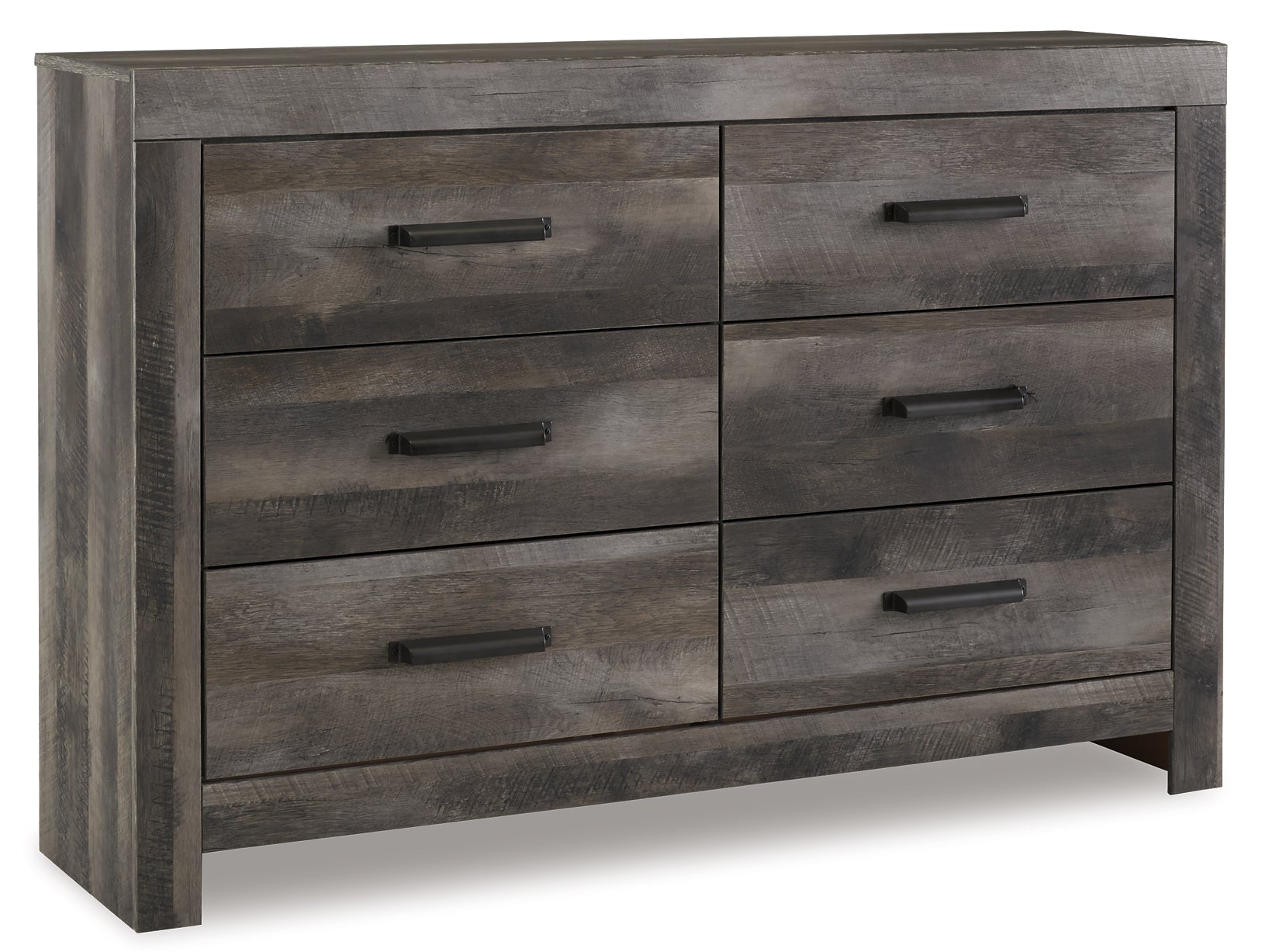 This bedroom package is sure to win your heart with its daring designer take on modern rustic. The bed and dresser’s crisp, clean and minimalist-chic profile is enriched with a striking replicated oak grain with thick plank styling and a weathered gray finish for that much more authentic character. The dresser features large-scale hooded pulls gracing the flush-mount drawers.