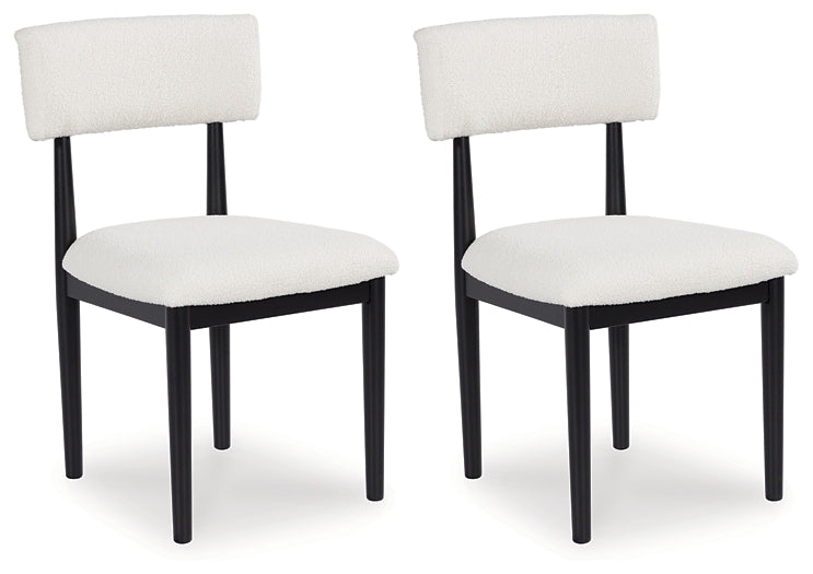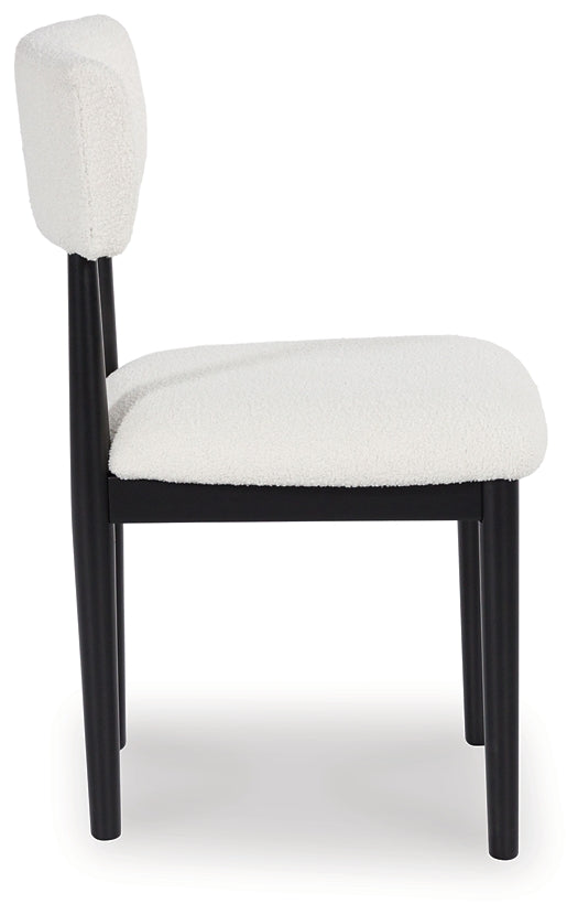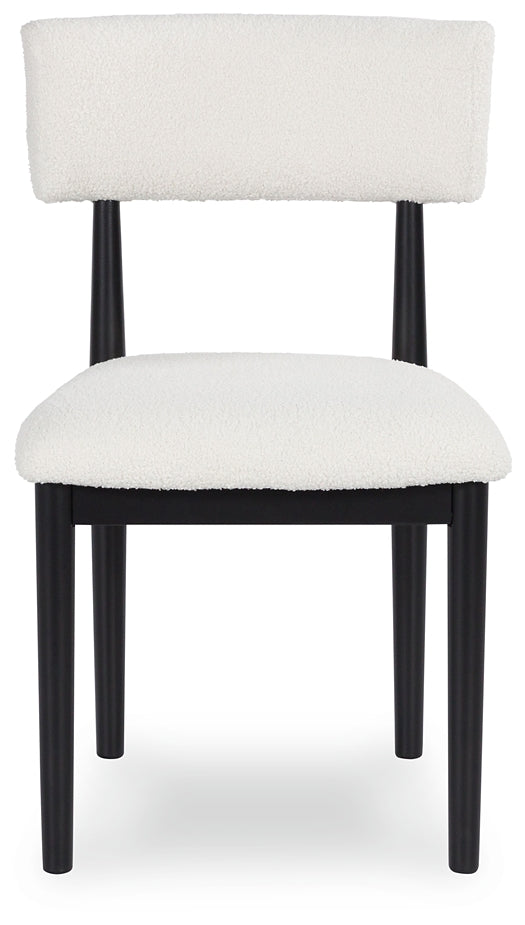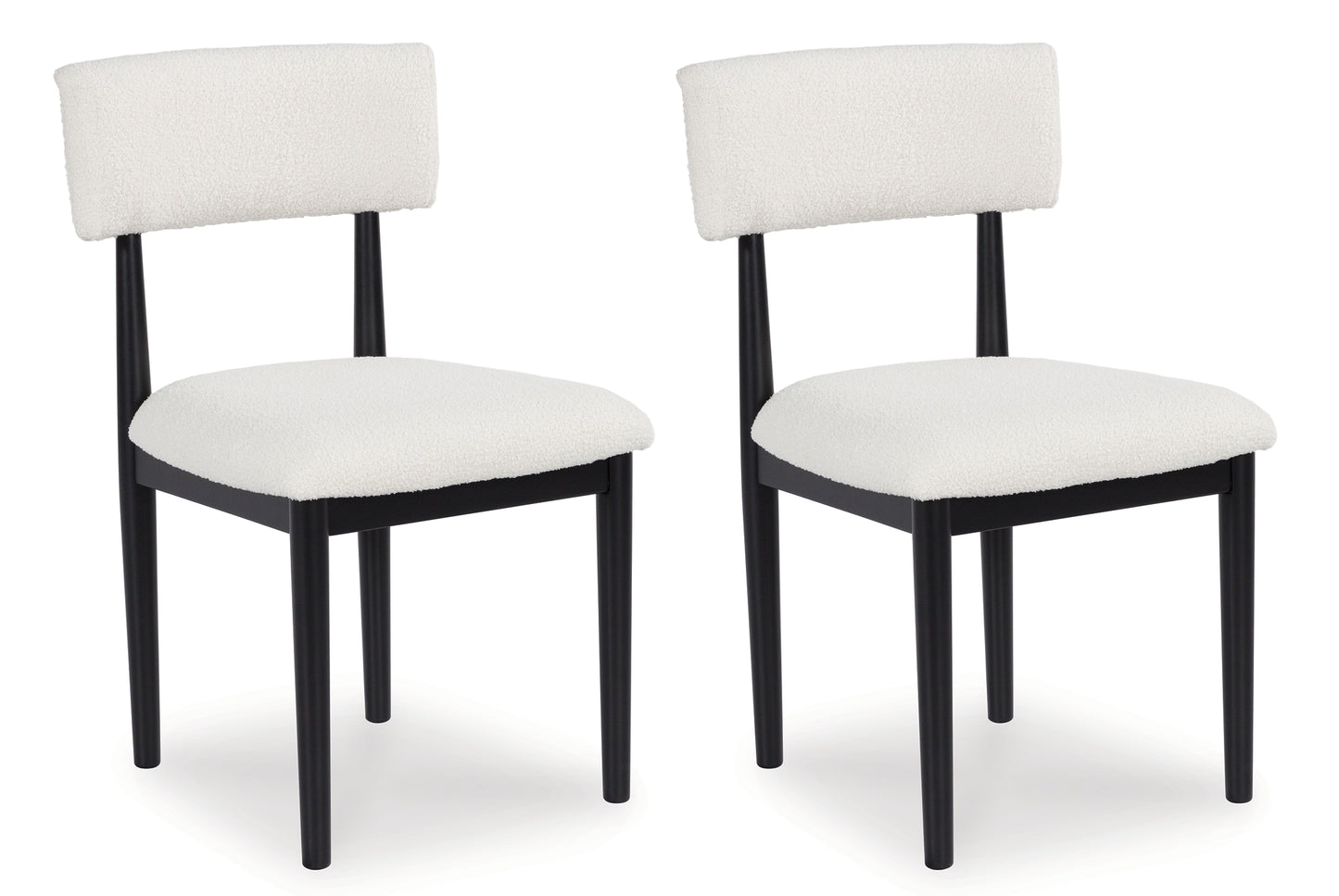 Clean lines meet cool curves with this dining chair. Simple round post legs and a black finish lend a modern vibe, while softly textured upholstery tempts you to sit and stay awhile. What a delicious choice for a dining room update.