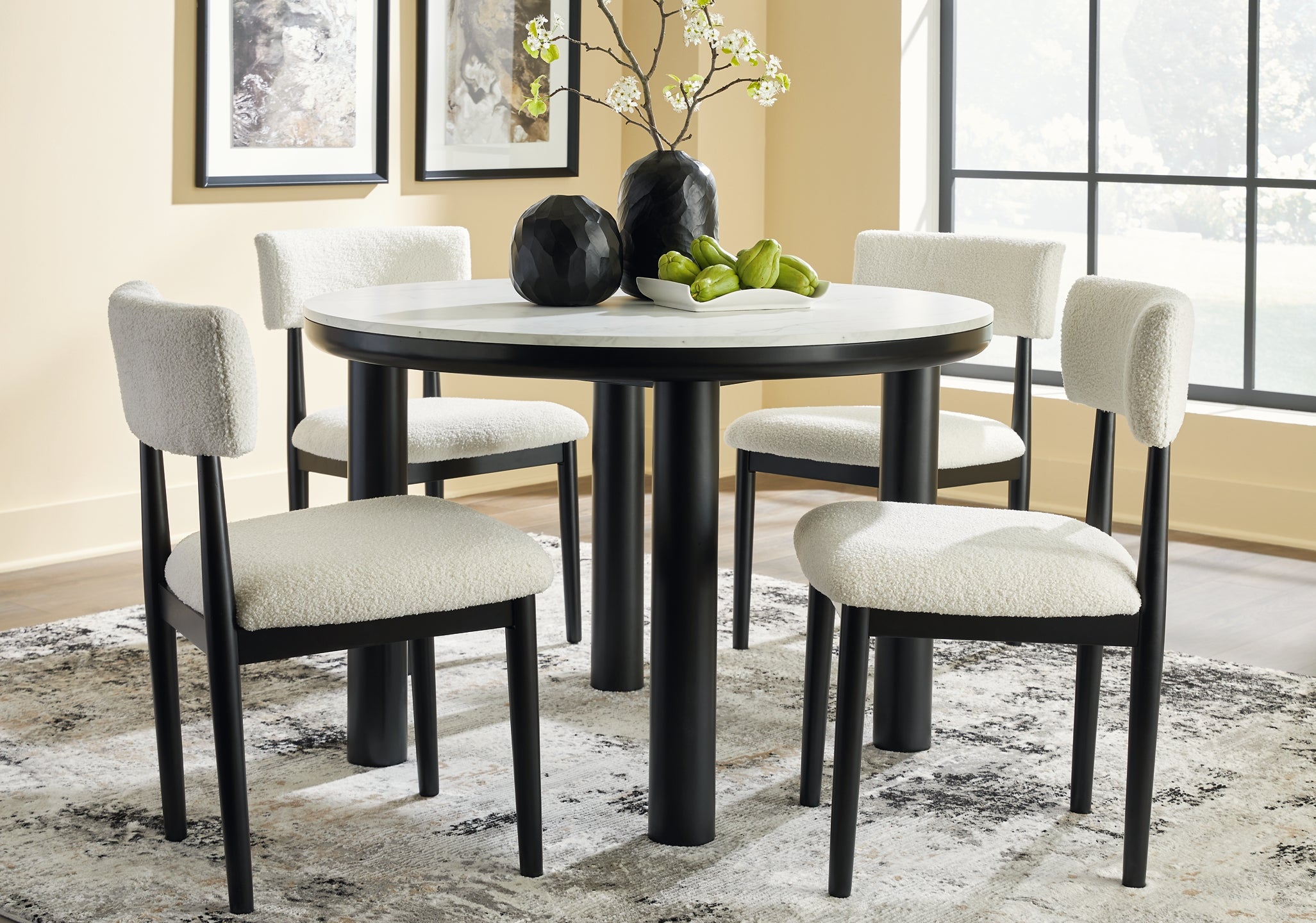 Clean lines meet cool curves with this dining set. Chunky round post legs and a black finish lend a modern vibe, while chairs with softly textured upholstery tempt you to sit and stay awhile. What a delicious choice for a dining room update.