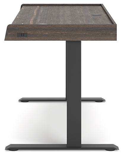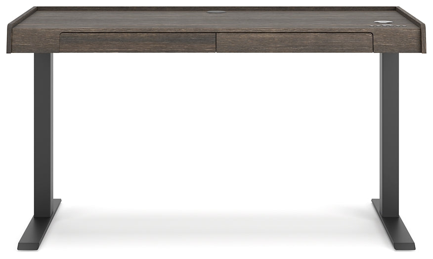 Craft a decidedly modern home office with this adjustable height desk. Its rich dark brown wood grain pattern has an air of refinement, while the two drawers keep workspace essentials organized in sleek style. Programmable height positions—along with USB, USB-C and wireless charging—round out this clean-lined, contemporary piece.