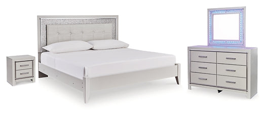 Bright, bold luxury. This queen upholstered bed dazzles with its attention to detail. Your love of glamorous style is reflected in the faux crystal tufted upholstery, exquisitely paired with faceted chrome-tone and glittery details. Complete with LED lighting around the headboard, it inspires you to live luxuriously every day—from waking up to reading before bed. Dresser, mirror and nightstand also included.