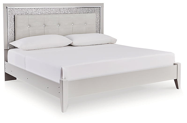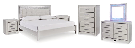 Bright, bold luxury. This bedroom package dazzles with its attention to detail. Your love of glamorous style is reflected in the tufted upholstery with faux alligator effect, exquisitely paired with faceted chrome-tone and glittery details. Complete with LED lighting around the headboard, it inspires you to live luxuriously every day—from waking up to reading before bed.